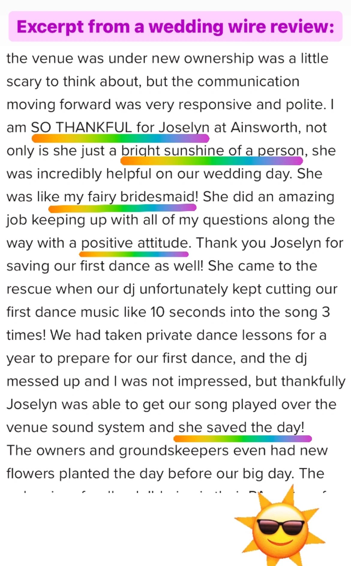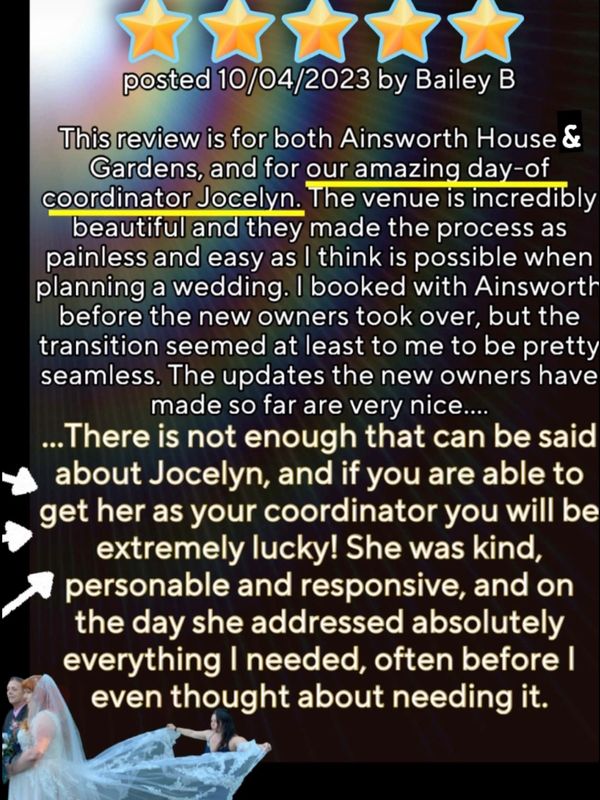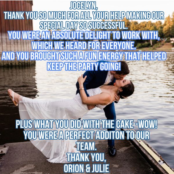 “…Our wedding planner, Jocelyn guided us through the entire process and was such a big help on the day. She had so many helpful suggestions and ideas and remembered everyone's name after only just meeting them.”